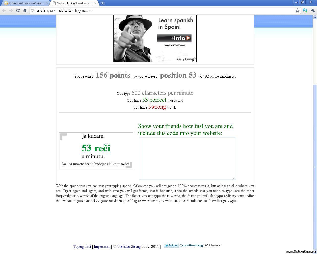 i jedan i drugi test sam uradila 1.Ukupno: Uspesno si sakupio 145 poena ! Brzina kucanja: 22 reci u minuti !