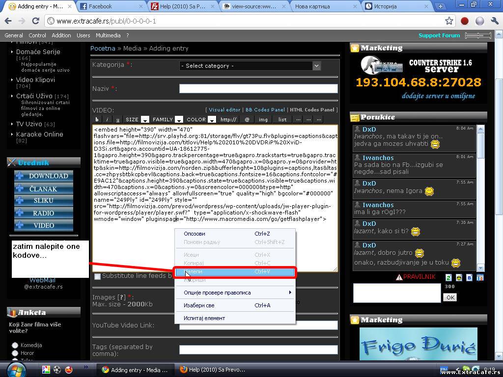 Code <embed src="http://www.nicijazemlja.com/portal/components/com_video/sa_titlom/playerODJEBAUS.swf?file=http://wt09.wrzuc.to/pokaz/playmp3/RSCgm7V/video.flv &captions.file=http://www.nicijazemlja.com/portal/components/com_video/sa_titlom/titl_uprzen.srt&plugins=captions &captions.fontsize=16&captions.back=true &skin=http://www.nicijazemlja.com/portal/components/com_video/sa_titlom/nicijazemljaskin.swf& logo=http://www.nicijazemlja.com/portal/components/com_video/sa_titlom/watermark.png &abouttext=www.nicijazemlja.com&aboutlink=http://www.nicijazemlja.com" type="application/x-shockwave-flash" pluginspage="http://www.macromedia.com/go/getflashplayer" quality="high" allowFullScreen="true" allowScriptAccess="never" width="640" height="400" /> OVAJ MOZDA NECE RADITI, JER SAM MORAO DA GA IZMENIM KAKO BI MOGAO DA STANE xD