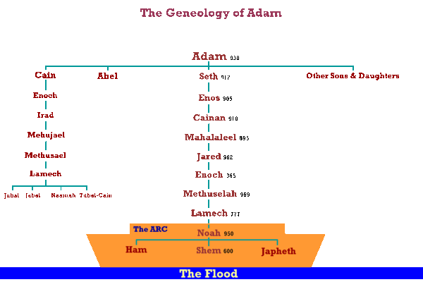 Адам је имао два сина један је био ратар и звао Каин, а други је био пастир и звао се Авељ. Каин је био лош и неправедан, док је Авељ био добар и праведан. Једнога дана њих двојица су приносили Богу жртве. Како је Бог знао какав је који од њих то Он прими жртву Авељову, а Кинову не. То изазва велику завист код Каина те он уби брата, Авеља. Овим се настави ширење греха међу људима. Због овога злочина прокле Бог Каина да никад нема среће, да се скита по земљи и да нигде мира не нађе. Тако се он потуцао по свету до краја живота. Адам и Ева тако изгубише оба сина, да би их утешио Бог им даде трећег сина, Сита. Он је био добар као Авељ. После њега имали су још много деце. Ситови потомци су били добри и послушни Богу, али су се намножили и Каинови потомци који су били рђави. И рђави искварише добре. Људи су бивали све гори и гори. Када се грех и зло проширише међу људима одлучи Бог да пусти велику воду на земљу и тако подави све живо на њој.