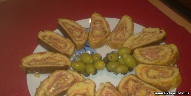 4. Zatim urolati rolat, staviti u pleh, probušiti po vrhu nožićem, staviti po parčence margarina i poprskati susamom...Tako peći rolat nekih 15-20 minuta na temperaturi od 200 stepeni. Kada se malo prohladi rolat seći na kriške i servirati uz salate, kiselo mleko i sl...