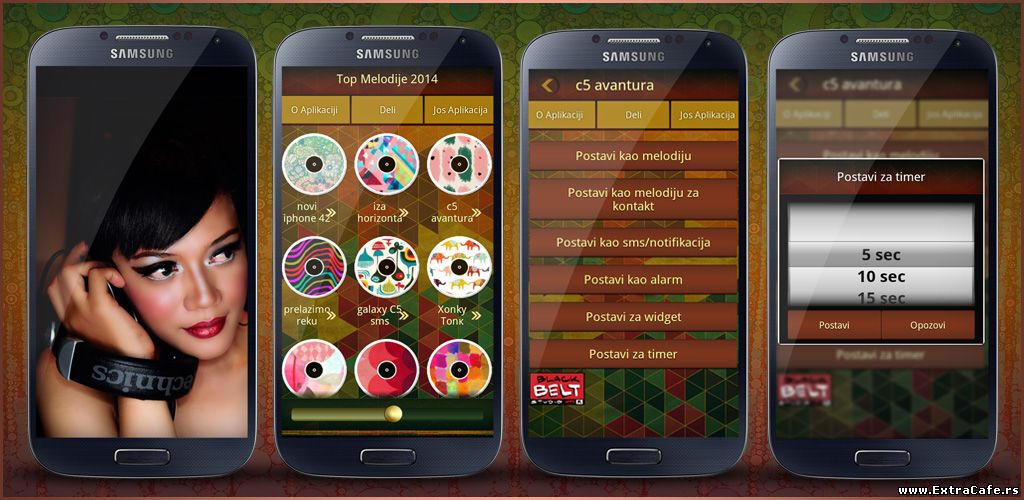 Dostupne funkcije: - Postavite kao melodiju zvona ili dodeli kontaktima - Podesite kao zvuk alarma I tajmera - Postavite za SMS zvuk - Postavite kao dodatak - Sacuvajte, saljite putem email-a I delite na svim drustvenim mrezama