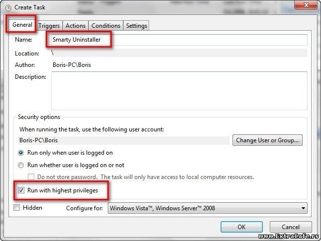 2. Pod tab "general" unesi točno ime programa za kojeg želiš kreirati task. 3. Stavi kvačicu "run with highest privileges"