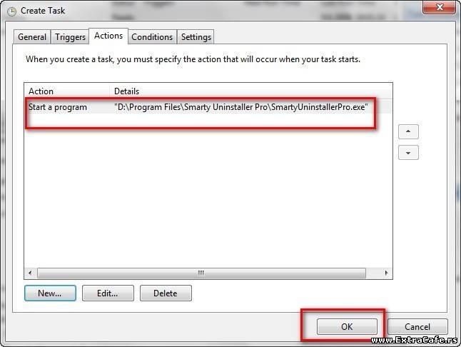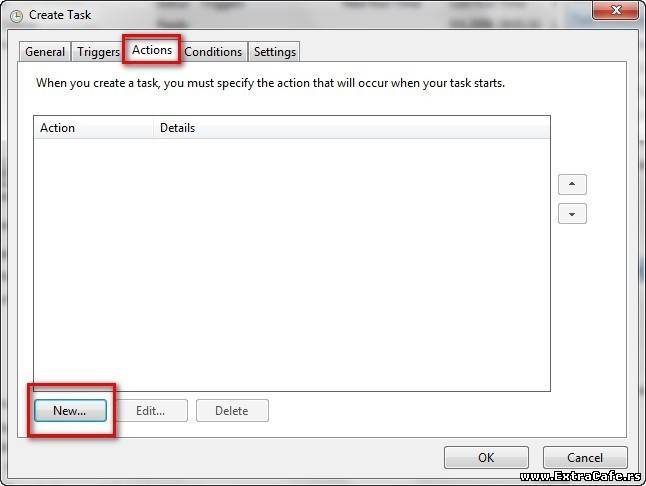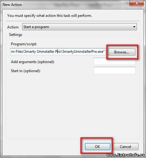4. Klik na Actions tab, u tom tabu klikni na browse i lociraj .exe file programa za koji kreiraš task... klik na ok
