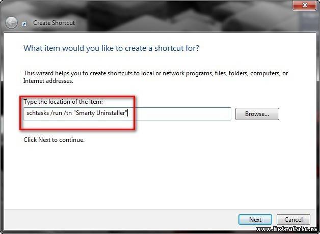 5. Nakon što si kreirao novi task zatvori task scheduler te na desktopu desnim klikom napravi shortcut, u cilj upiši: schtasks /run /tn naziv tvog programa.