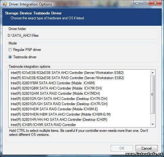 Kliknite na „Insert“ i odaberite „Single Driver“. Unesite putanju do foldera gdje su smješteni ranije pomenuti SATA/RAID drajveri (folder sa fajlom „txtsetup.oem“) i kliknite na bilo koji od .inf fajlova u njemu, osim u slučaju AMD čipseta, gdje je potrebno odabrati direktorijum RAID/i386 i .inf fajl u njemu. Pojaviće se prozor kao na slici: