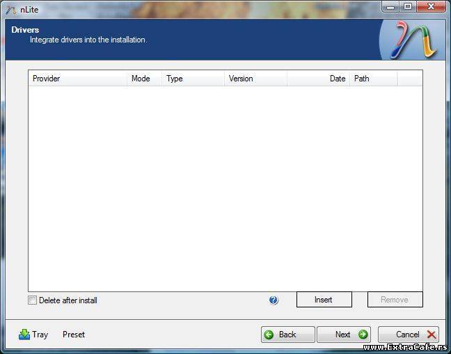 Ovaj način zapravo predstavlja integraciju drajvera za SATA kontrolere direktno u instalaciju Windowsa XP, tačnije u njen tekstualni dio. U ovom postupku upotrebljava se (već poznati) program pod nazivom Nlite, koji možete skinuti sa http://www.nliteos.com/. Prije postupka (kompletan) sadržaj instalacionog CD-a Windows-a XP treba kopirati u folder na HDD-u. CD može sadržavati i originalni Windows XP ali i verziju sa integrisanim SP1 ili SP2 (preporučljivo). Takođe, u ovom postupku će nam trebati i drajveri, koji su već pomenuti u prethodnom načinu (i koje smo tada kopirali na disketu). Naravno, biće nam potrebni samo folderi sa pomenutim drajverima (folderi koji sadrže „txtsetup.oem“), ne i sama disketa. U slučaju Intel čipseta, potreban će biti sadržaj diskete. Nakon instalacije, pokretanja Nlite i klika na „Next“, dočekaće nas sledeći prozor: