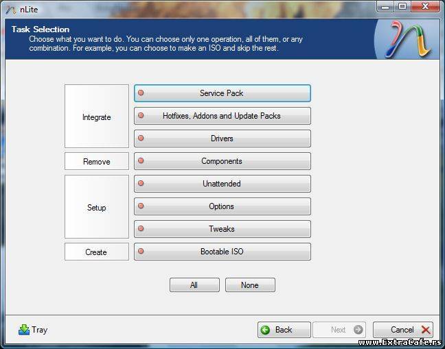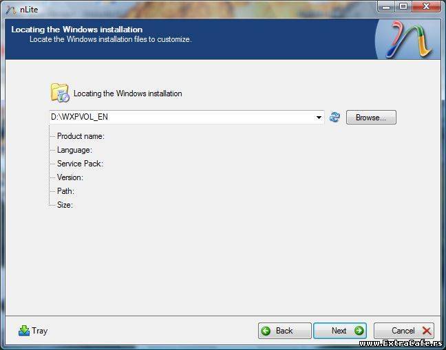 Označite opciju 3. („Integrate Drivers“) i zadnju („Create Bootable ISO“). Sad je prilika i za instalaciju Service Pack-a 2 za Windows XP (ako već nije integrisan, označite prvu opciju, „Integrate Service Pack“). Kliknite na „Next“. Ako ste na prethodnom prozoru označili opciju „Integrate Service Pack“, sada unesite putanju do instalacije SP1 ili SP2. Kliknite „Next“. Ako ste preskočili instalaciju service pack-ova, stižete direktno na sljedeći prozor: