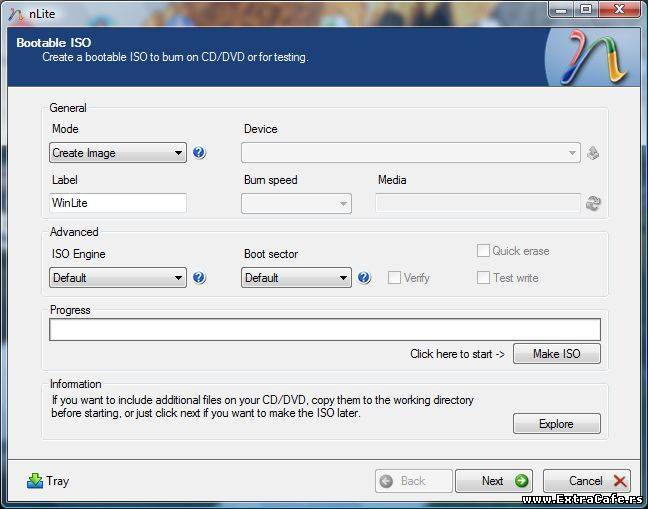 kliknite na „Make ISO“, na sljedećem dijalogu unesite lokaciju gdje želite da .ISO bude snimljen i kliknite na „Save“. Kada program završi sa pravljenjem .iso fajla, kliknite na „Next“ i potom na „Finish“. Dobijeni .iso, potrebno je narezati sa Nero-om ili sličnim programom na CD, kao image fajl. Bitno je napomenuti da je prije instalacije Windowsa XP, sa ovako integrisanim instalacionim CD-om, potrebno obavezno u BIOS-u uključiti AHCI, odnosno „Native“ SATA, inače ćitav postupak neće imati smisla.