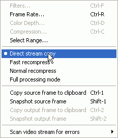Otvorite film u VirtualDub(Mod)-u. Kliknite na VIDEO i označite DIRECT STREAM COPY.