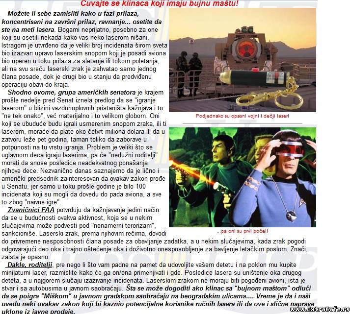 lukacar95bre, upravu si, ali, manem se ja toga... kad sam bio klinac, jesam imao te lasere i zezao sam komsije kroz prozor... ali to je bilo kad sam bio klinac... sad malo zrelije razmisljam, i ne koristim te `sigracke`. Mada, i sada negde imam zaturen 1 laser, negde u sobi...