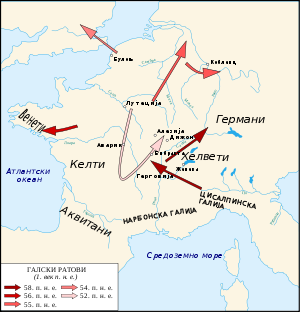Galija Trijumviri su podelili vlast na način da je Cezar dobio za upravu Galiju. 58. pne. Cezar je započeo Galski rat, koji je trajao do 51. pne.. Rezultat rata je bila potpuna pobeda Rimljana i pokoravanje srednje Evrope. 55. pne. Pompej i Kras su izabrani ponovo za konzule a Cezar za prokonzula na rok od još pet godina. 54. pne. Cezarova kćer Julija je umrla tokom porođaja. Kras je poginuo u ratu sa partima u bitci kod Carrhae, 53. pne.. Nakon Krasove smrti Pompej i Cezar se počinju međusobno udaljavati u stajalištima, što konačno dovodi i do građanskog rata između njih.